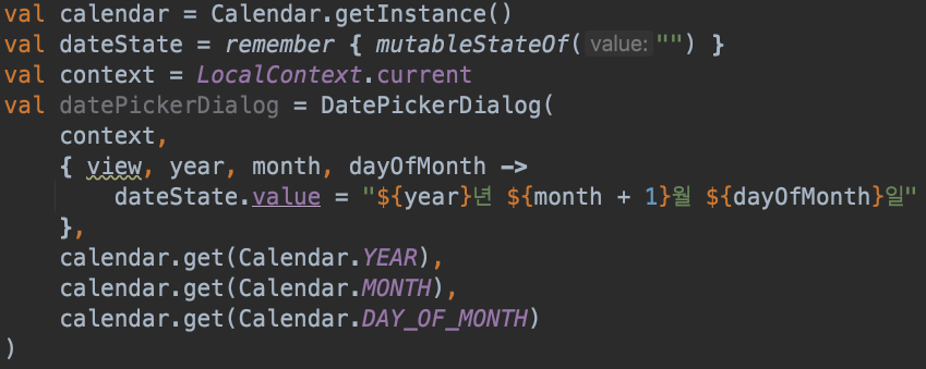 여기서는 dateState에 값을 String으로 저장하였습니다.