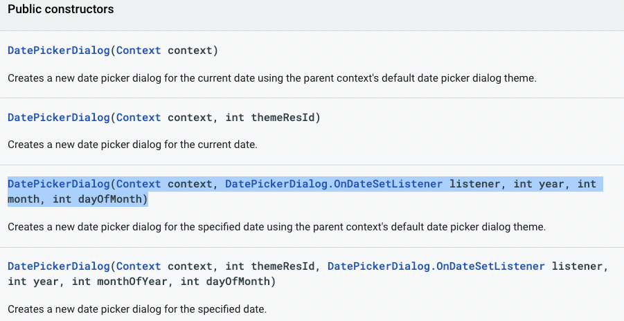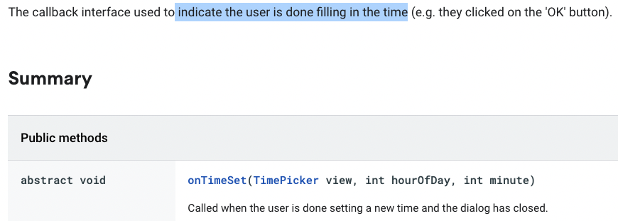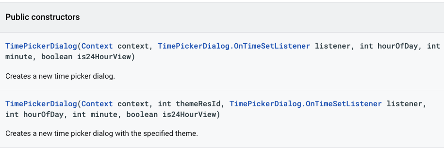 이 클래스의 생성자를 보면, 다음과 같이 OnTimeSetListener 콜백을 넣어주어야 한다는 것을 알 수 있습니다.