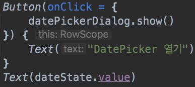 아래와 같이 버튼을 누르면 datePicker를 보여주는 show()함수를 호출해주고,