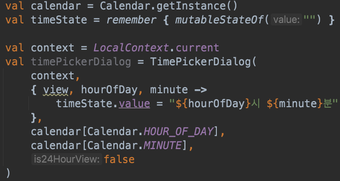 다음 할일은 TimePickerDialog 객체를 만들어 주는 것 인데요.
