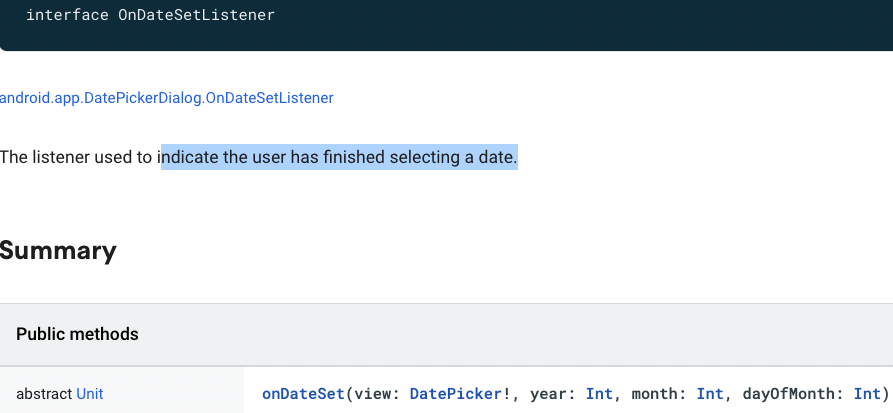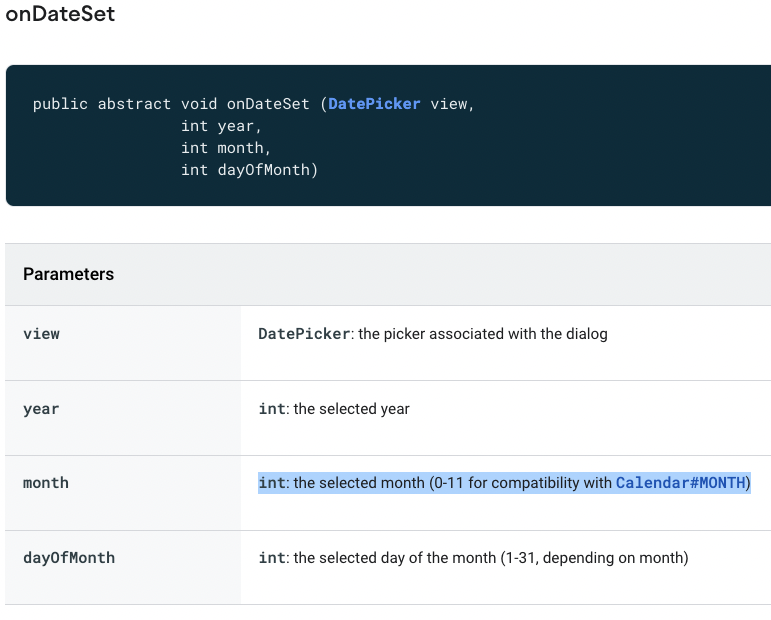 2번째 인자에 아래와 같이 OnDateSetListener 콜백을 구현해주기만 하면 됩니다.